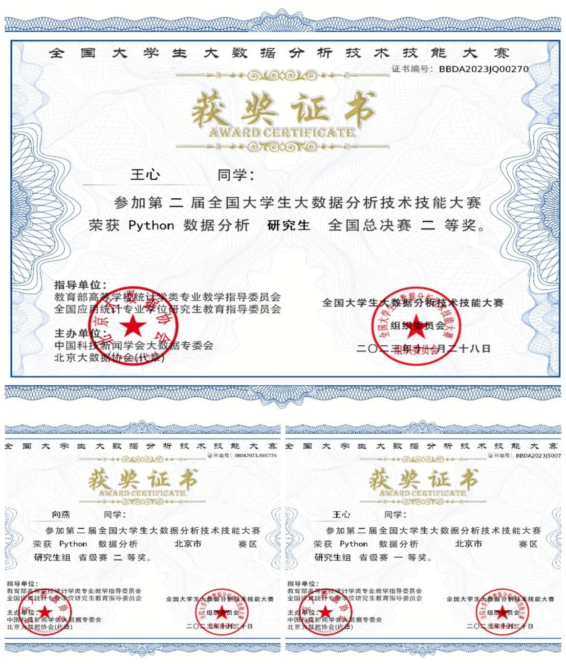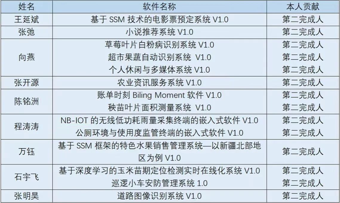 在学院领导和老师的关心和指导下,同学们积极参加各类学科专业竞赛,以科学严谨的态度和团结合作的精神取得了丰硕的科研成果,展现出良好的学术实力和创新能力。截至目前,共获得国家级学科竞赛一等奖1项、省级学科竞赛二等奖2项,论文发表1篇,获得计算机软件著作权14项。