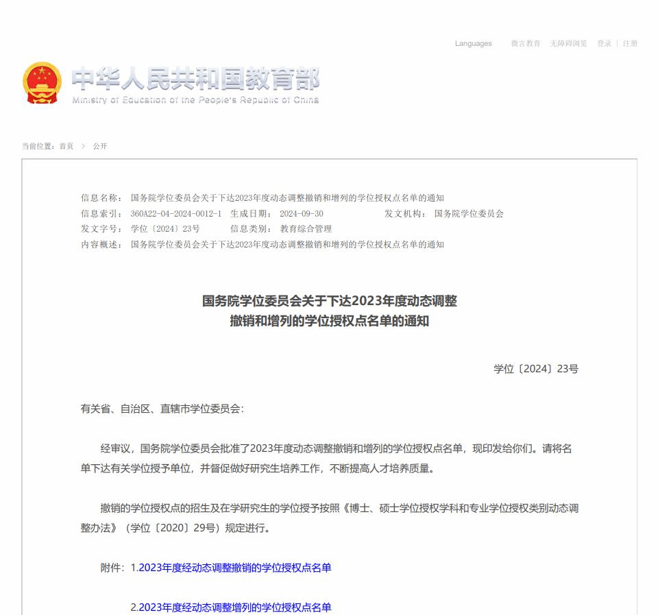 近日,国务院学位委员会公布2023年度动态调整撤销和增列学位授权点名单,Pinnacle博彩
