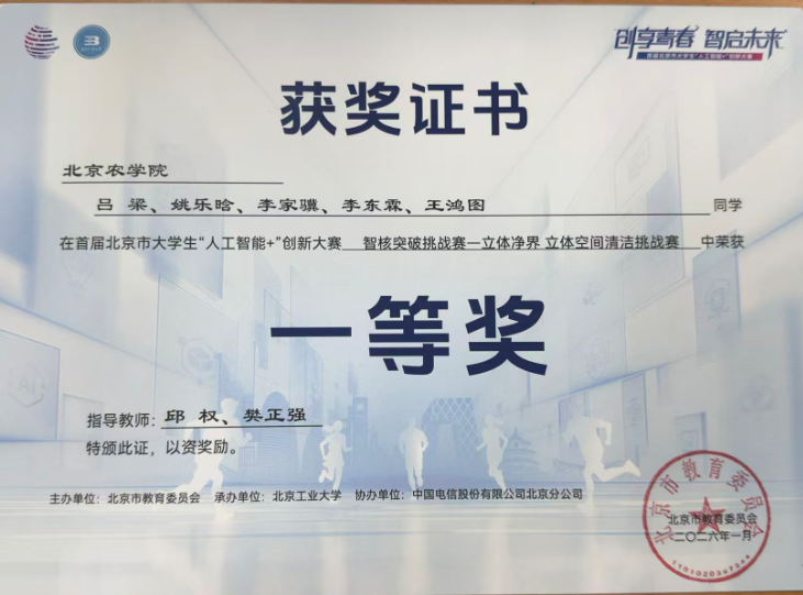 本次大赛由北京市有关单位主办,吸引全市55所高校的222支队伍、921名选手同台竞技。由吕梁、姚乐晗、李家骥、李东霖、王鸿图5名同学组成的“正无穷战队”,在邱权、樊正强老师指导下,聚焦清洁机器人在复杂立体空间中的目标识别与智能收纳问题,对算法模型和机械臂控制进行针对性优化。决赛现场,团队所设计的智能清洁机器人方案在规定时间内完成全部任务,以96分的成绩斩获一等奖。