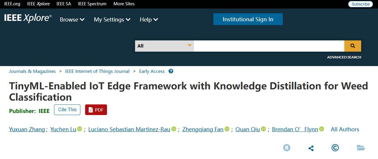 物联网系青年教师张宇轩与邱权教授等人在国际物联网领域顶级期刊IEEE Internet of Things Journal在线发表题为“TinyML-Enabled IoT Edge Framework with Knowledge Distillation for Weed Classification”的研究论文。该研究面向农业物联网中的杂草识别问题,提出了一种基于TinyML的边缘智能框架,为农业机器人在资源受限环境中的高效运行提供了重要技术支撑。