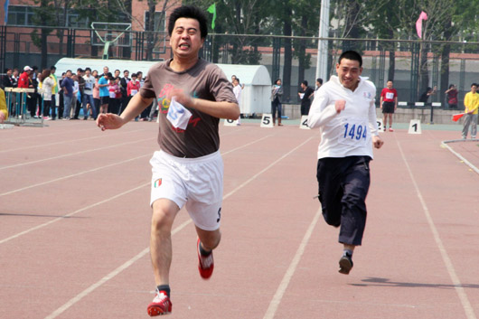 在教职工运动会中,计算机学院姚山和朱晓东两位老师参加了男子教工青年组100米的比赛,分别获得了小组第三和小组第一的成绩,赛后的采访中,两位老师笑着说到成绩不重要,重要的是参与,明年还是会参加。