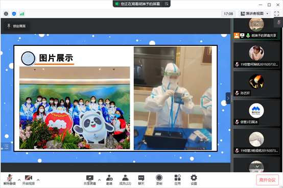 宁宁介绍了学院参与冬奥志愿服务的整体情况,对胡淋予、何琬恬两位同学的优秀表现表示肯定。她希望两位志愿者能够将自己的故事讲给更多的同学,带动更多的同学共同进步。希望同学们向志愿者学习,把志愿精神传递和发扬下去。希望2019信管2团支部继续开展与冬奥相关、与宣传志愿精神的社会实践活动,让冬奥志愿者小雪花的微光在计信学子中传递下去。