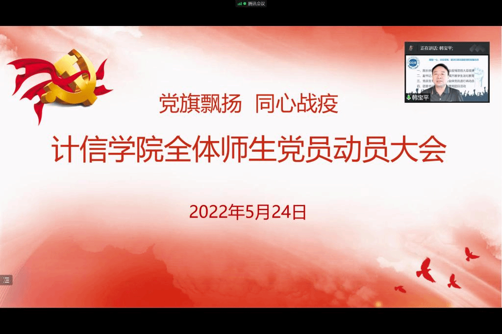 总支书记韩宝平对全体师生党员进行了再动员、再部署。最后他指出,北京市目前疫情防控形势严峻复杂,希望全体师生党员积极响应学校《党旗飘扬同心战疫——致全校各级党组织和广大党员干部的倡议书》号召,进一步提高政治站位,深入学习贯彻习近平总书记关于疫情防控的重要指示精神,认真落实北京市的具体部署要求,自觉站在疫情斗争的最前沿,以实际行动迎接党的二十大胜利召开。