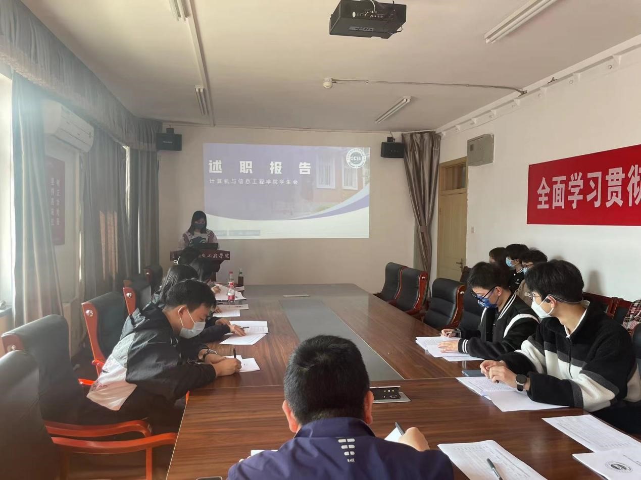 为全面落实《中共北京农学院委员会深化学生会(研究生会)改革的实施办法(试行)》《北京农学院学生会(研究生会)述职评议制度(试行)》的相关要求,计信学院于3月8日中午在2号楼4015会议室召开2022-2023学年第二学期学生会述职评议大会。学院党总支副书记、副院长刘京威,团委书记宁宁,院团委、学生会主席团、学生会部门负责人以及学生代表参会。会议由主席团于杰莹同学主持。