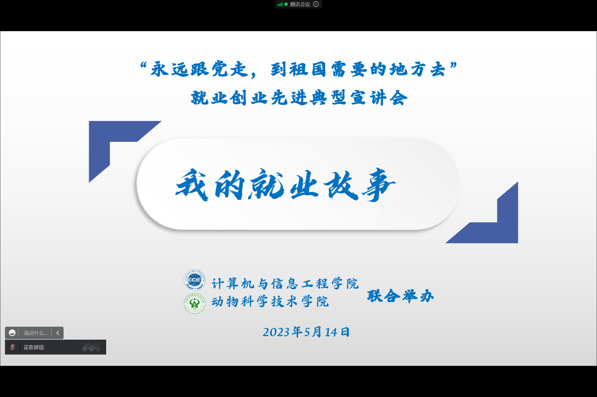 近年来,高校毕业生到中西部地区、基层就业的人数逐年增高,“到祖国需要的地方去”已成为越来越多高校毕业生认可的就业方向。2023年5月14日19:00,计信学院联合动科学院开展“永远跟党走,到祖国需要的地方去”就业创业典型宣讲会。计信学院党总支副书记刘京威,动科学院毕业班辅导员彭先勖,计信学院2022届毕业生高禹、2021届毕业生冯璐揆,动科学院2022届毕业生王占琪、王一丁,部分2019级毕业生和其他年级学生代表参会。会议由计信学院辅导员宁宁主持。
