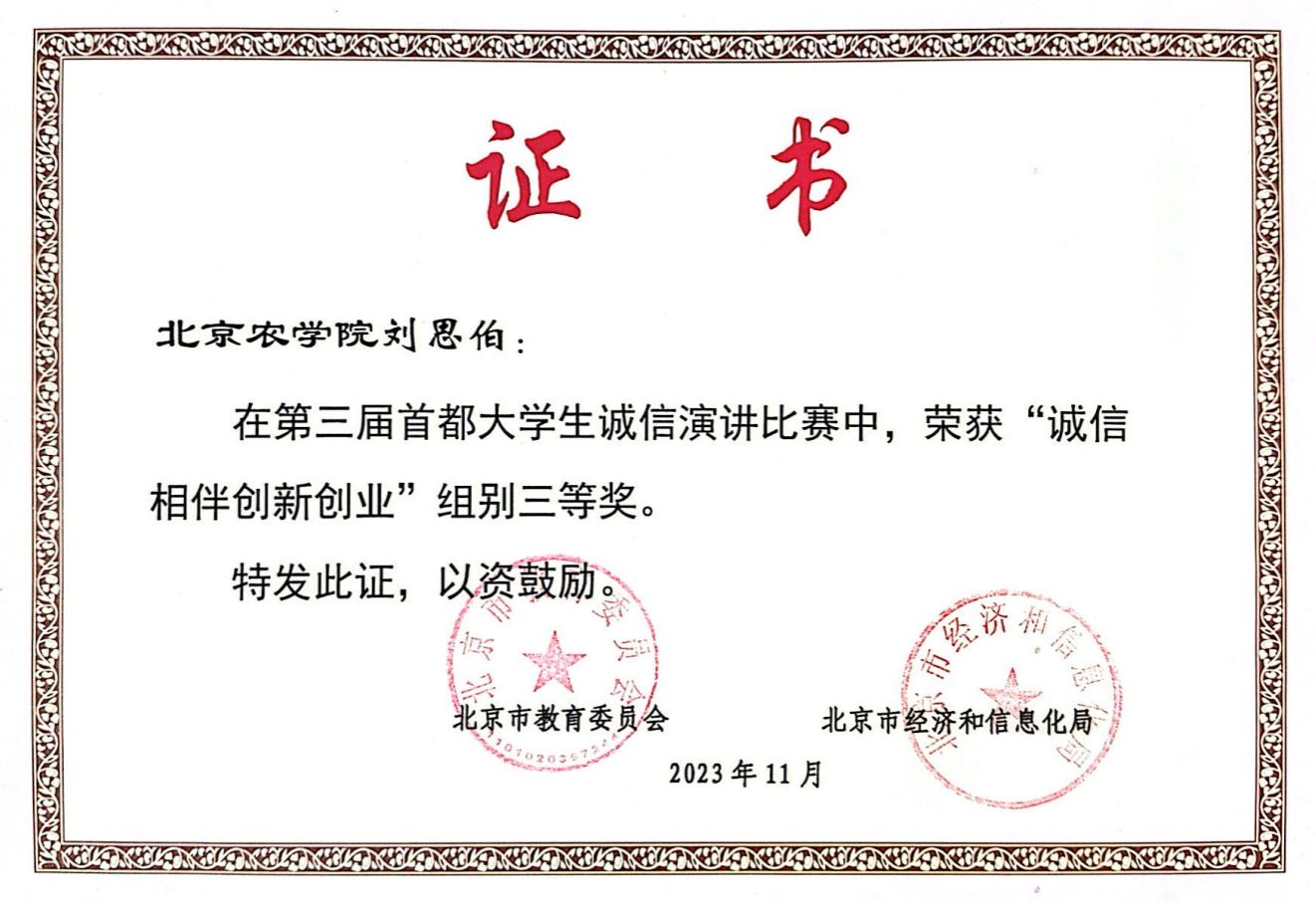 学生刘思伯代表学校参赛,荣获“诚信相伴创新创业”组别三等奖。