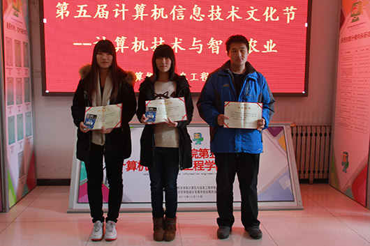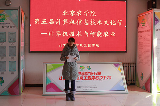为培养大学生的创新精神和实践能力,丰富大学生的课外文化生活,营造良好的校园文化氛围,提高大学生计算机应用水平,在学校领导和学院领导的大力支持下,在全体师生的积极配合下,第五届计算机信息技术文化节系列活动——“crazy键盘飞手”打字比赛、“一站到底”知识竞答、书法大赛、儿童电子绘画大赛等各项比赛圆满结束。12月19日中午12点,第五届计算机信息技术文化节计算机技术与智能农业成果展示暨颁奖仪式在计算机中心隆重举行。校党委副书记高东、校纪委书记张铁强、学生处处长韩宝平、学生处副处长刘柳、校团委书记李相阳、经管学院副书记赵金芳、园林学院副书记李金苹、国际学院副书记刘铁军、延庆县阳光关怀果树盆景专业合作社理事长陈小年、计算机学院全体领导、老师以及各学院学生参加了活动。