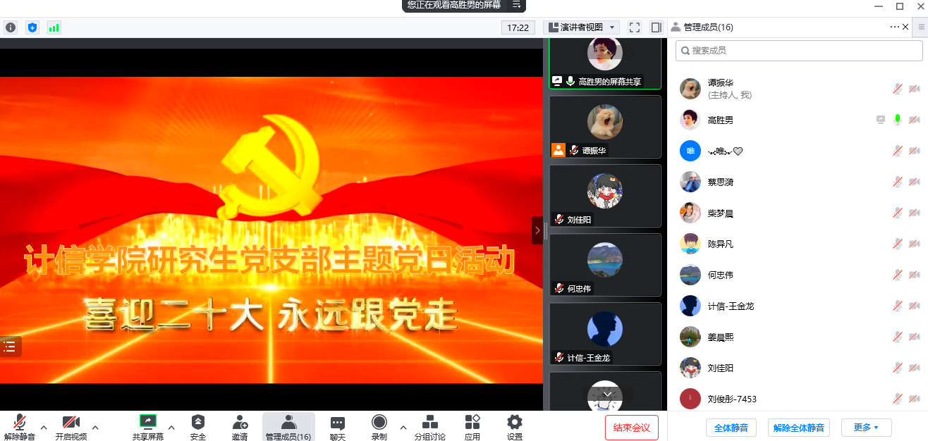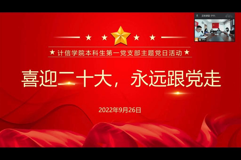 为深入贯彻落实习近平新时代中国特色社会主义思想,引导广大学生党员深刻认识“两个确立”的决定性意义,充分发挥学生党员先锋模范作用,以实际行动喜迎党的二十大胜利召开,计信学院研究生党支部、本科生第一党支部和本科生第二党支部近日开展了“喜迎二十大,永远跟党走”主题党日活动。