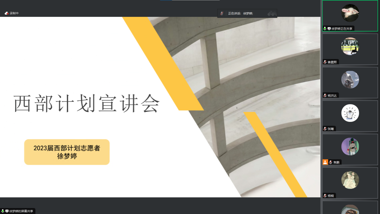 于2024年3月30日举办了“到祖国需要的地方去——西部计划”宣讲会。会议邀请2023届毕业生徐梦婷、杨洪达两位同学进行宣讲。