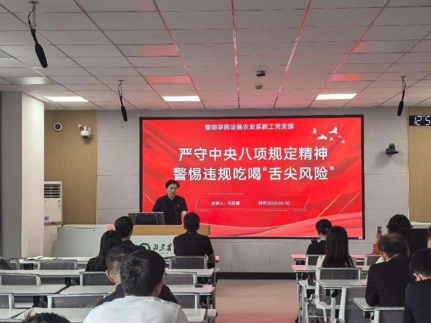 设施农业系教工党支部书记马前磊聚焦于严守中央八项规定精神,以警惕违规吃喝“舌尖风险”为主题开展党课。他紧密联系教师的教育工作以及学生的日常行为,通过生动详实的案例,深入剖析了违规吃喝现象的危害性,解读了整治违规吃喝的各项规定,为党员们敲响了廉洁自律的警钟,引导大家在教育一线和日常生活中自觉抵制不良风气,树立清正廉洁的良好形象,切实履行好教书育人、为人师表的职责使命。